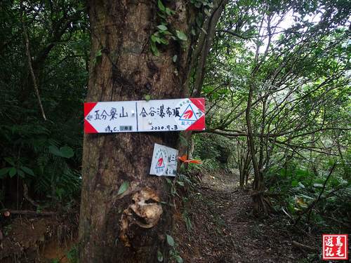 從叉路口取左約走5分鐘水泥路,階梯爬上2分鐘,至五分寮山登山口(位於左側),有藍天隊「往五分寮山、合谷瀑布」指標,