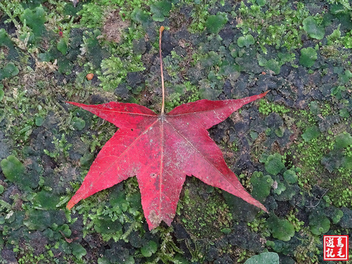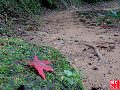 續走三貂嶺步道原路回程,一葉楓紅偶然飄落步道上,宣告秋天的腳步乍到。 1090912