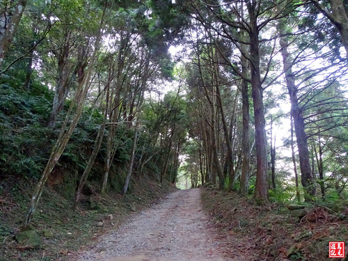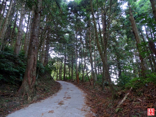 為免愛車折騰受傷,採徒步往登山口,林道行經綠竹林間,再往前行緩坡上爬至支線1K的「童話森林」民宿露營區,