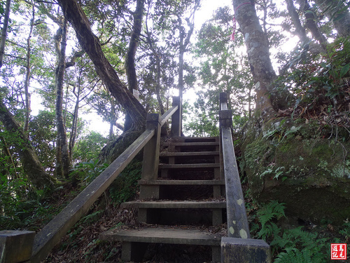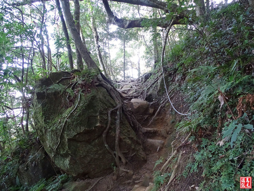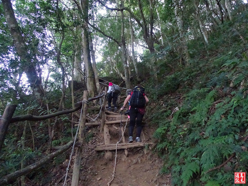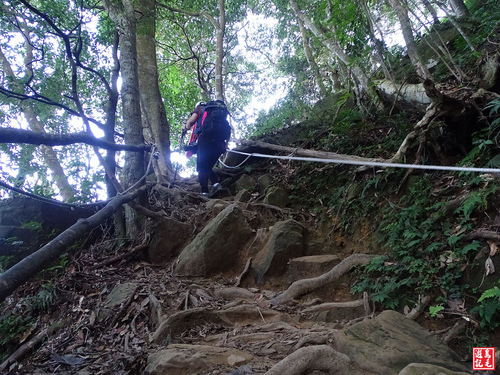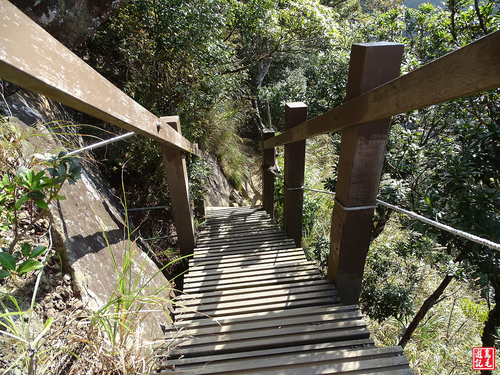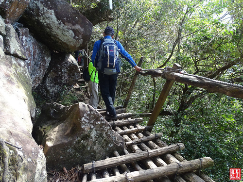 這段好漢坡爬起來很吃力,或攀繩拉索、或陡石階、木棧階梯,長達400公尺,高低落差至少5-60公尺以上。