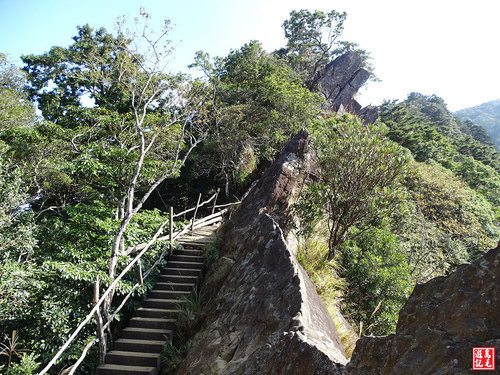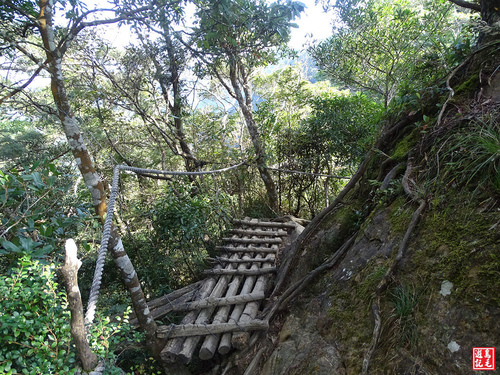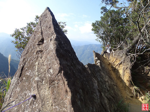 續上爬不久,山谷之間下切後再陡上,有峭壁岩稜,看起來十分驚險,此處就是回音谷了,續往前棧道木梯通過稜線峭壁區,