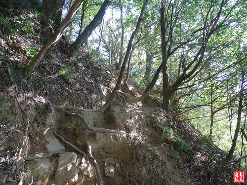 北得拉曼步道林相優美,登山路線自0.6K好漢坡之後就超級陡,發現一旁有突出山腰間樹幹,網路看過有FB、IG網美拍照打卡,