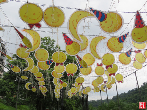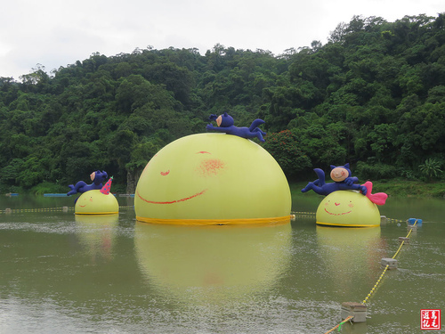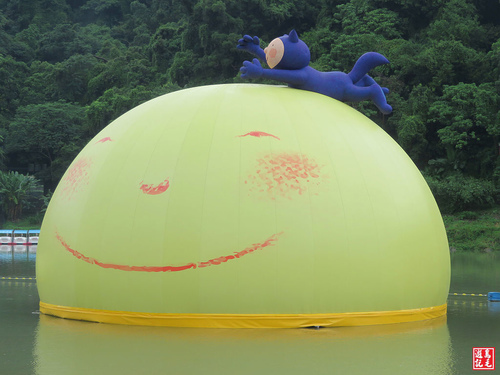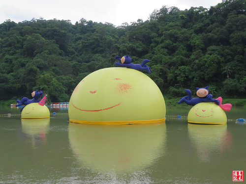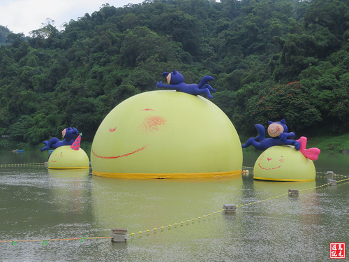 三顆幾米月亮,一顆大月亮、兩顆小月亮佇立在碧潭水中央,展期從2019/9/13到2019/11/13,夜晚亮燈時間是17:30-22:00。