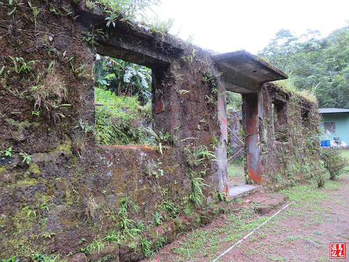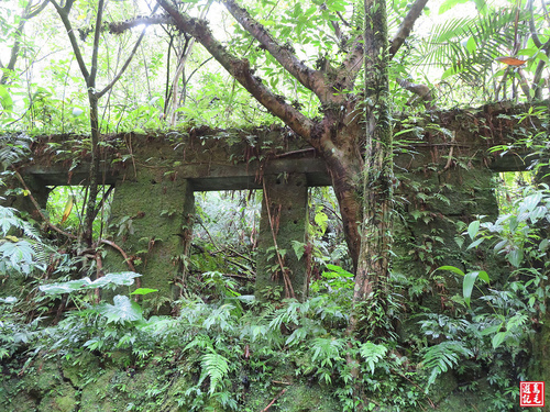 接近廢棄礦坑事務所遺址,步道旁出現滿覆青苔的駁坎砌石牆面,還有掩沒在樹木及荒草之中的廢棄建物與運煤橋遺跡,