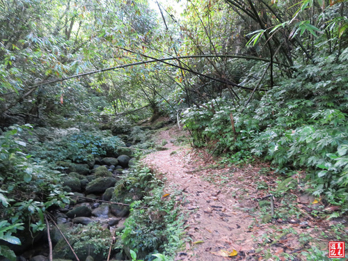 沿溪畔行,又有綠竹林,此路段有拓墾及古厝地遺跡,接下來從柳杉林緩坡至越嶺鞍部,然後取原路折返。 1080803