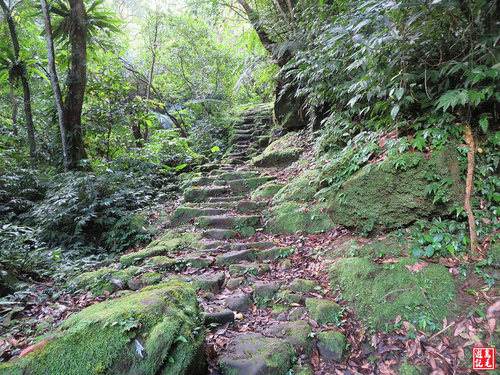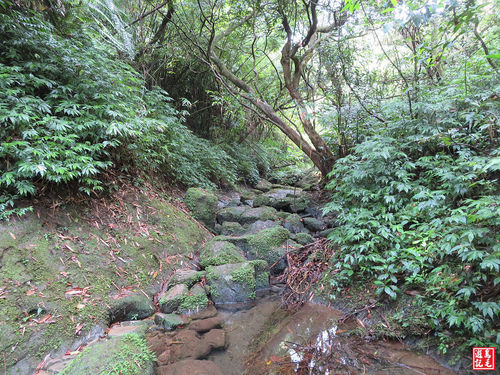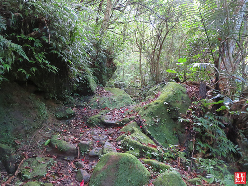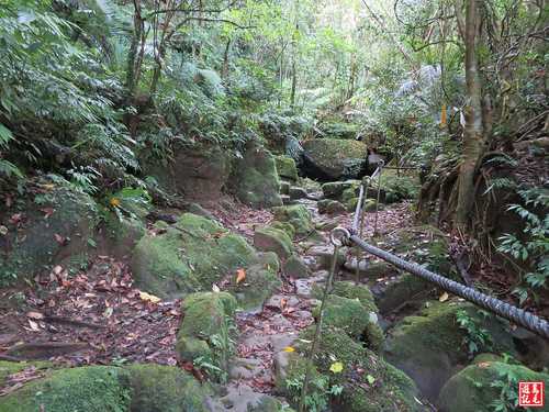 經過中央尖叉路(不取),步道續直行,路況較為崎嶇難走,穿越溪谷之間滿覆青苔石塊,須小心溼滑,竹林綠影隨風搖曳,