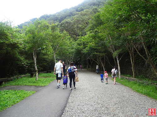 離開滿月圓遊客中心,繼續走在林間步道上,來到一處休息區,發覺有的遊客吃滷味、有的冰奶茶、肉包...