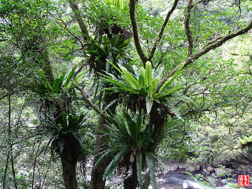 往遊客中心步道平緩好走,旁邊是寬大的蚋仔溪,水量充沛,水質清澈,水聲淙淙。岸邊樹幹上長滿茂盛的山蘇,