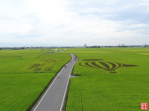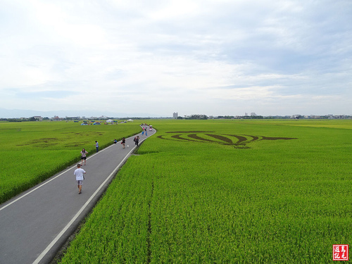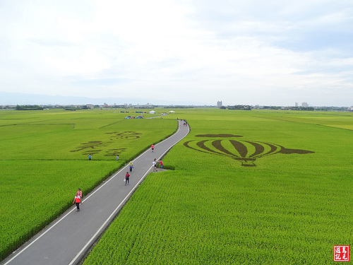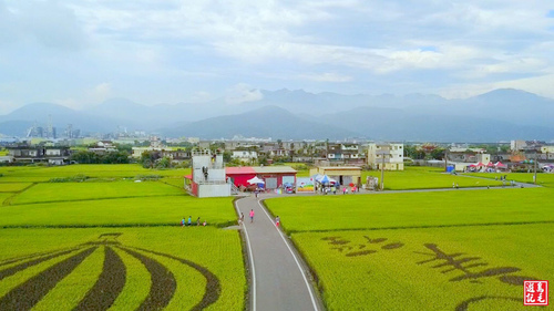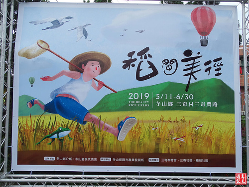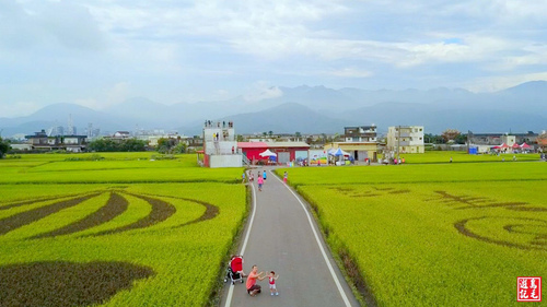 宜蘭版伯朗大道的三奇稻間美徑,每年6月當地稻穗轉為金黃色,成為蘭陽平原無敵美景,「稻間美徑」4大字,