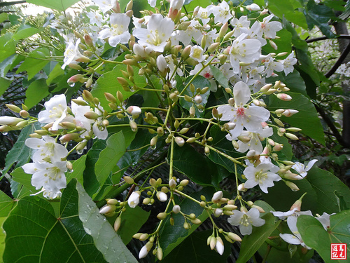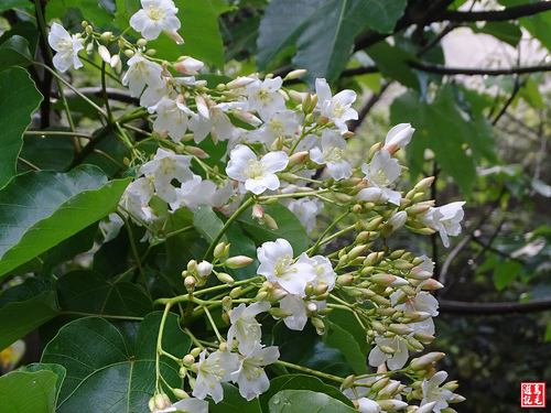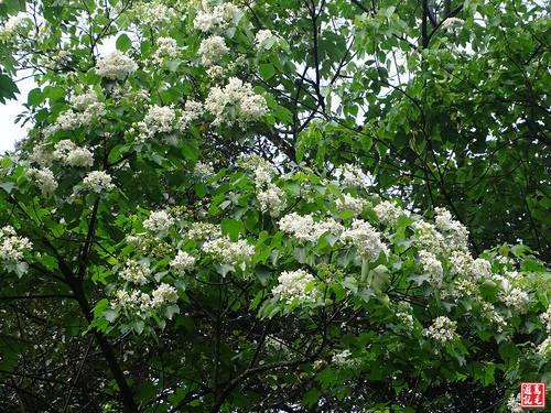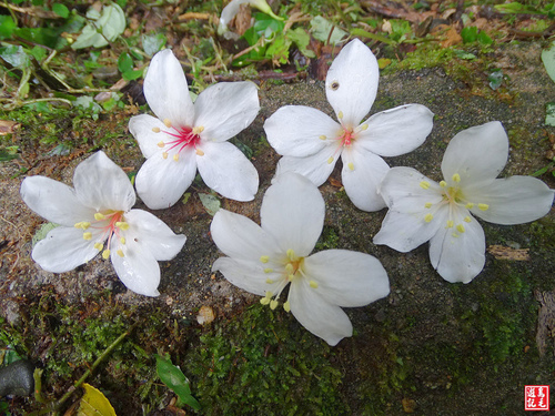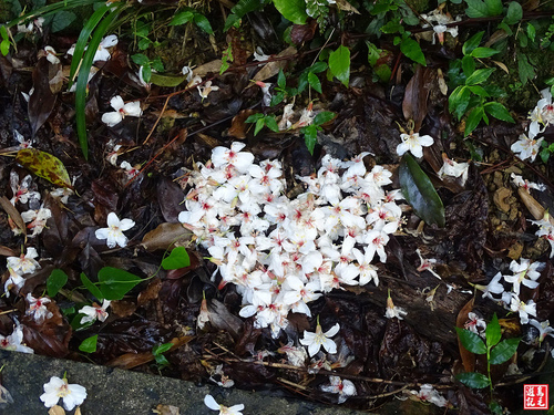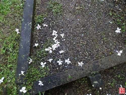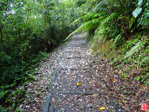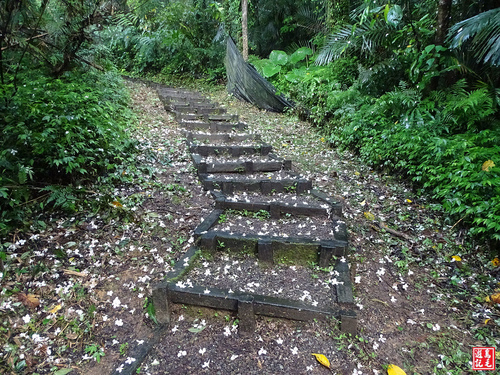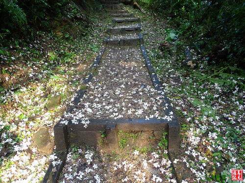 再往前走不遠又見許多桐花灑落步道上,一大早還沒有其他遊客,獨享雪白的桐花世界,漫步在步道上,氣氛寧靜而清幽。