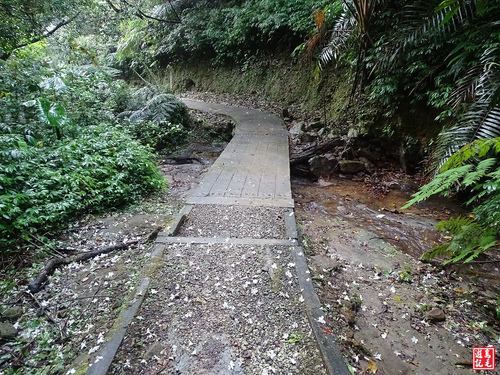 接下來轉為緩下坡,沿溪而行,潺潺水聲伴隨著旅人獨行的腳步,目前此區桐花已開四五成,預計5月上旬進入盛開期。