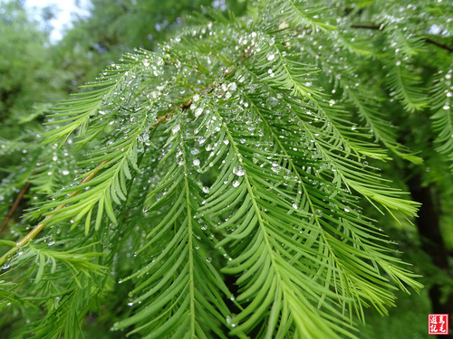回到步道口,瑪西桐花步道輕鬆環繞一圈只花35分鐘。昨夜的露珠,還眷戀在落羽松葉面上,似欲語還休? 1080428
