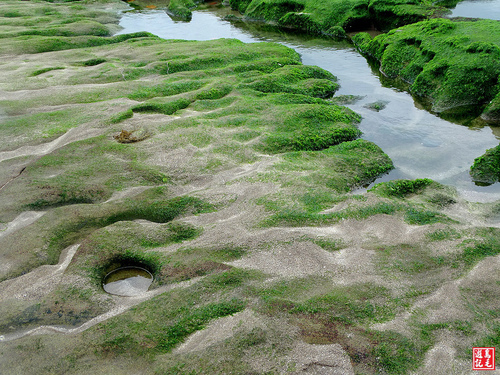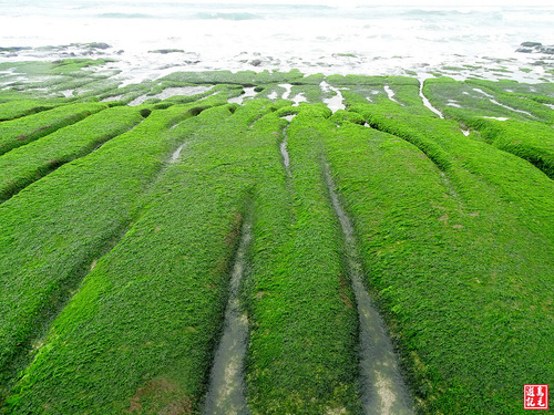 冬天北部東北季風強勁,濤天的浪花滋潤了石槽的岩面,滋生綠色的石蓴、海髮絲等藻類,形成令人讚嘆的「綠石槽」景觀,