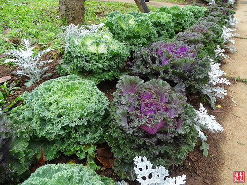 步道旁種植的彩色植物,看起來有點像是高麗菜,但它的形貌和顏色很豐富好看,引起我的好奇,於是上網查了一下,