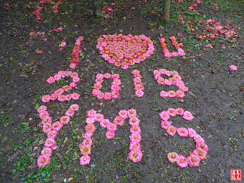 有心人士撿拾花朵鋪成了愛心與字樣,若有阿娜答同行會是多麼滴羅曼蒂克呀!花徑不曾緣客掃,蓬門今始為君開。