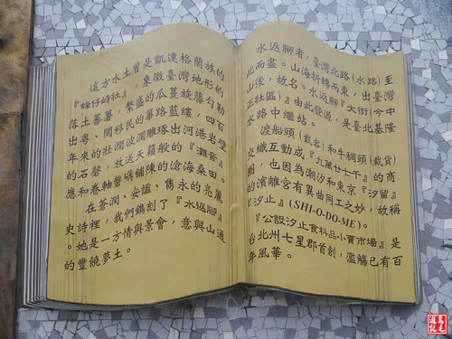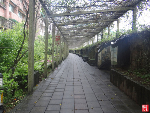 可以擺脫醫院藥水氣味,再往前行經過抽水站,從汐止老街的街尾轉入禮門社區綠廊,堤防牆壁上有一書本壁飾,