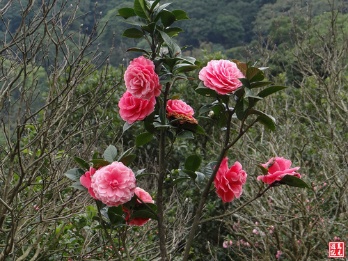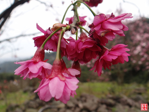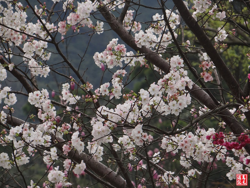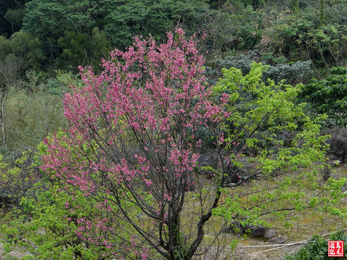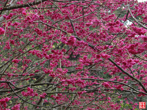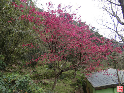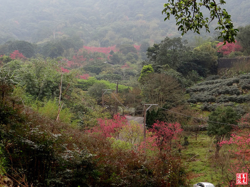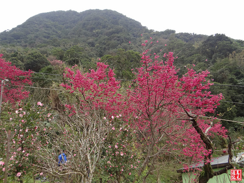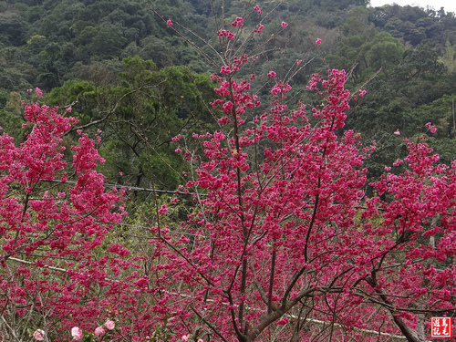 重瓣櫻(八重櫻)火紅盛開,火力全開,在青山綠林之中格外出色,雖然是陰時多雲的天氣,沒有藍天陽光,依舊夭壽紅的...