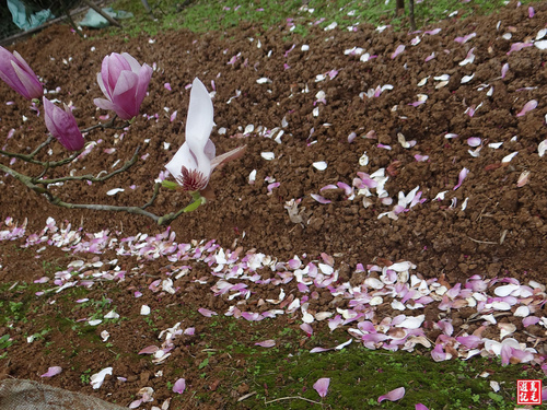 我沿著楓樹湖產道下往楓樹湖站,望見木蘭花瓣飄落,花開花謝又怎是令人迷惘,落紅豈是無情,化作春泥更護花。 1070218