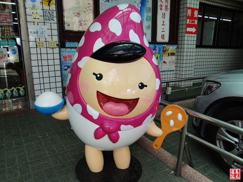 富里鄉農會農特產品展售中心門口有2位可愛玩偶,是以本地特產「富麗米」發想設計,開心逗趣的模樣,歡迎遊客到來。