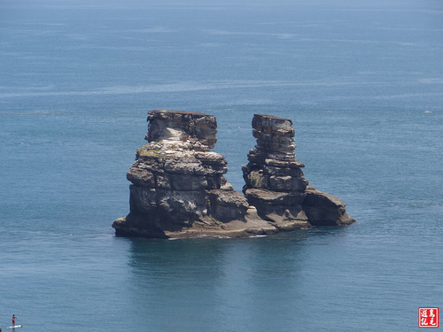 海平面是位於燭台之下;而位於觀景亭看燭台雙嶼,看起來海平面高出燭台甚多。