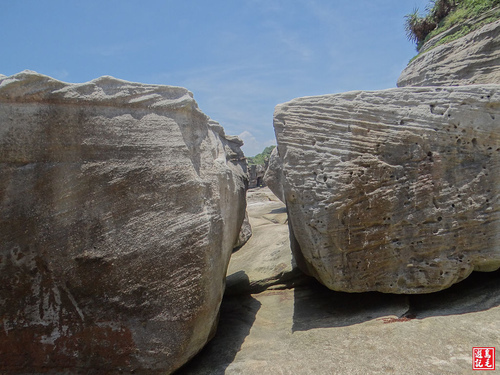 沿著岩岸往前行,看到整座岩塊中間有一裂縫缺口,由此小洞鑽過去,可至這座岩塊的後面,這處天然形成的景觀就是一線天。