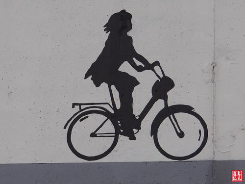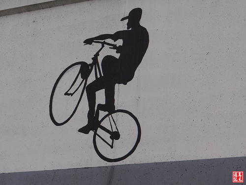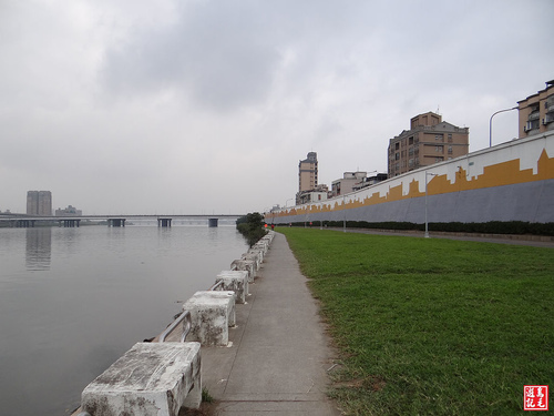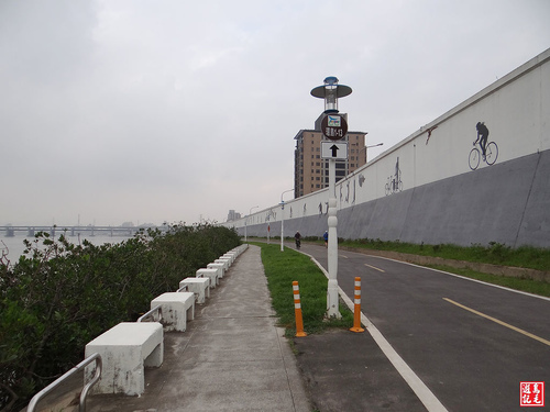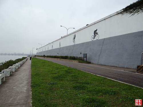 沿著淡水河濱自行車道直走,堤壁上有自行車剪影圖案,頗為生動傳神,堤岸旁低矮的水筆仔一路沿伸繁衍,河濱適應性很強,