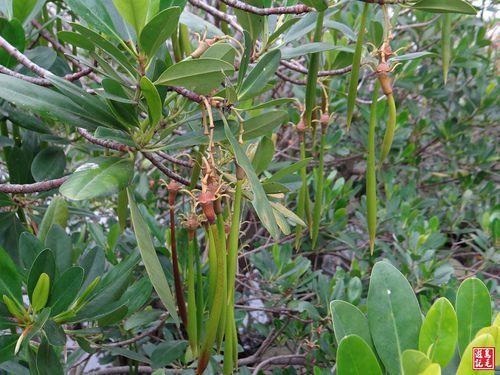 水筆仔是一種很特別的植物,「筆狀胎生苗」成熟後才會掉落,隨著潮水飄流靠岸著地,或幸運地直接插到軟泥上,再自行長大。