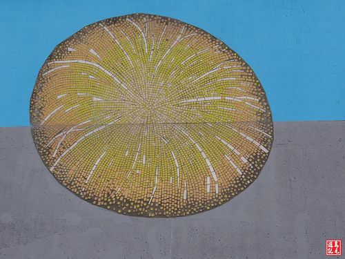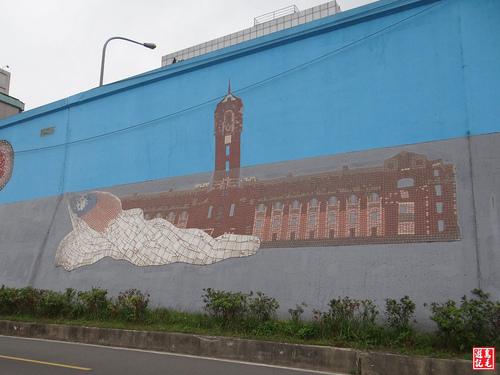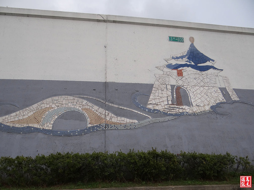 有別於社子島的彩繪階梯,堤壁上除了自行車人物剪影圖案外,更有獨具一格的馬賽克磁磚彩繪拼貼作品,美化河濱視覺景觀,