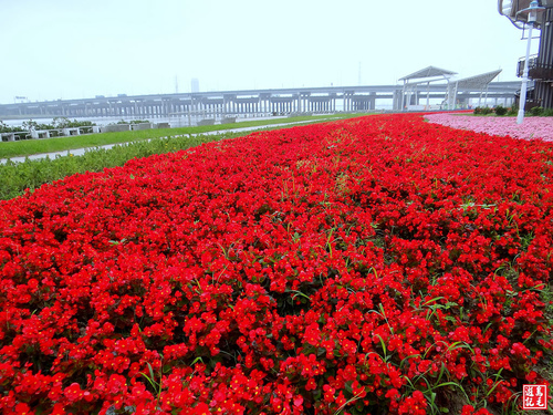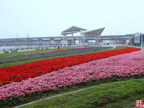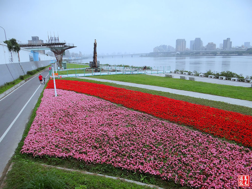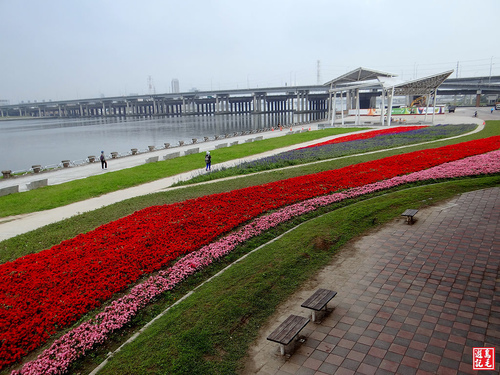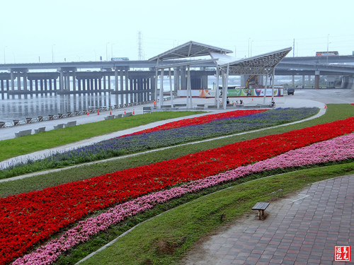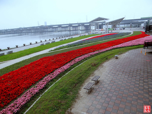 爬上跨堤景觀平台,自高處俯瞰花海地景,是一種美麗的視覺饗宴,利用紅、粉、綠、紫、黃不同顏色花朵,若彩帶般鋪陳開來,
