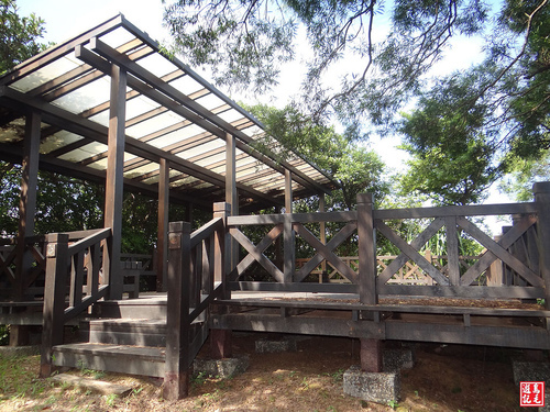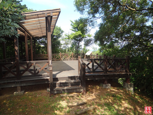 在觀景平台的涼亭下,遊客可以休息賞景,或是閱讀中英文對照的導覽牌,有助於對當地人文地理方面的進一步認識。