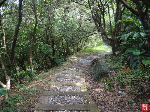 步道採枕木框碎石路面,是屬於生態工法,具有自然排水性,即使雨天行走也不會泥濘濕滑。
