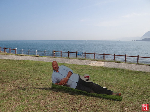 回首可俯瞰潮境公園前的灣澳景色,太陽很大有夠熱的,非要撐傘遮陽不可。
