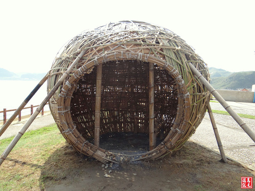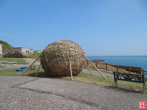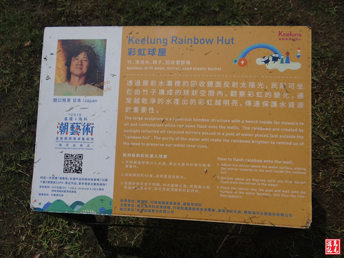 由日本設計師關口恆男創作的「彩虹球屋」是以竹材編製而成,透過屋前水灘回收鏡面反射陽光,民眾可坐在球狀空間內,