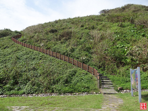 稜線步道沿著靠海這一側而行,左有叉路可上小丘的ㄇ字型觀景台,右有叉路可經雕堡下濱海岩岸,