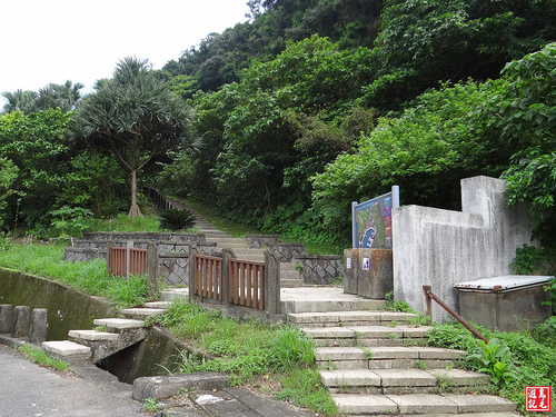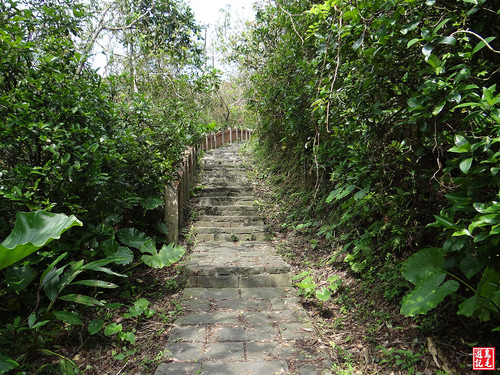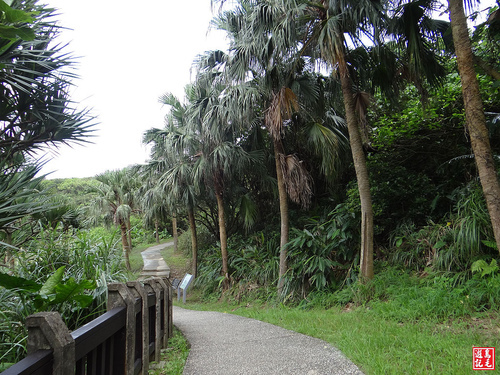 步道末段接近油庫,寬大的洗石子階梯兩側有高大椰子樹,椰影搖曳,頗有南洋異國風情,此區沿途多有民俗植物分布,