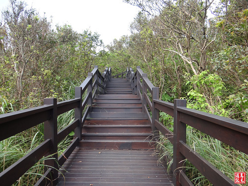 幾年前因颱風災損的望幽谷稜線步道已整修完竣,從停車場一旁石階上來,漸往上爬轉為木棧階梯,通過低矮的灌木林間,