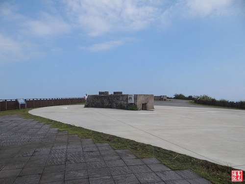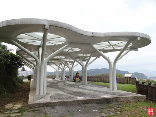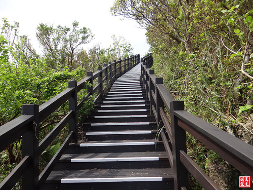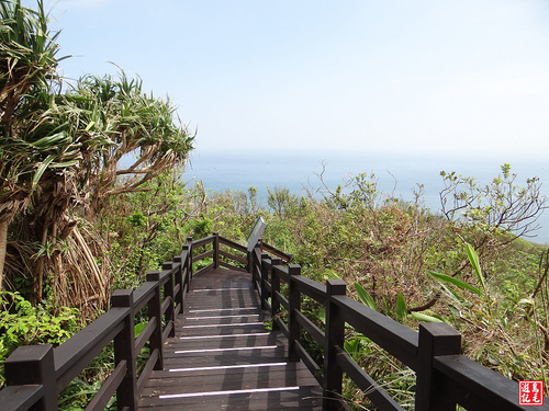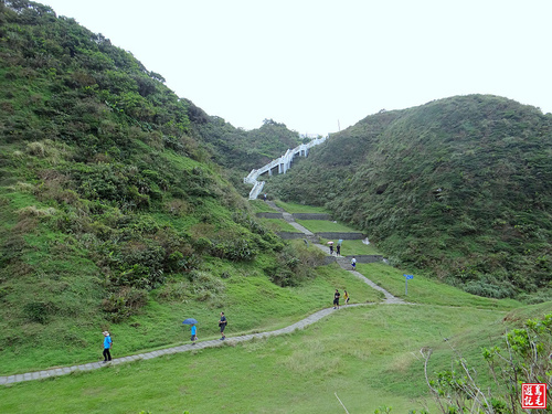 經過漁業電台階梯步道下來80高地,設有橢圓形屋頂白色鋼構涼亭,再往前方柏油路下來就是65高地停車場,取右白色曲階下望幽谷,