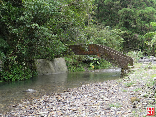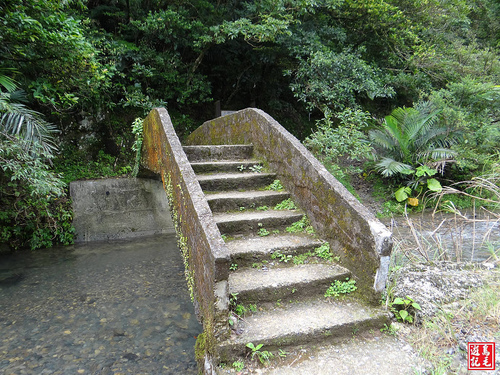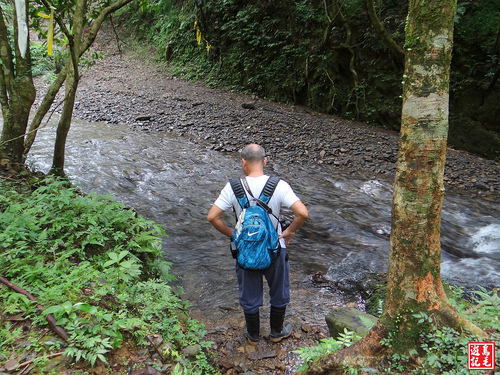 步道口進入約走7-8分,至第一越溪處,因連日下雨感覺水勢不小,Fuli老神在在不疾不徐率先通過,我緊跟在後,但因涉水動作稍大,