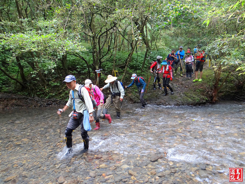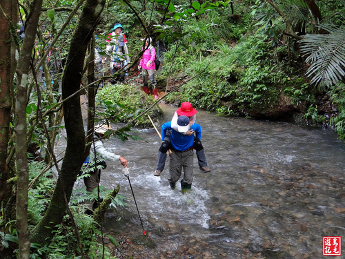 左腳鞋筒內濺入少許溪水(右腳還乾的耶),後面隨行的大隊山友,有人未備雨靴,或擔心水流湍急,就要男士服務一下揹過來。