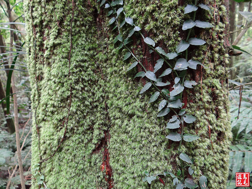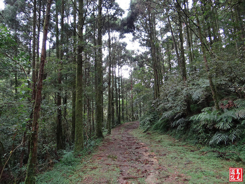步道沿途盡是高大筆直的柳杉林,巨木遮天沒有陽光,感覺有點陰暗,距步道口390公尺處有右叉路往鷹子嶺(距離4000公尺)。