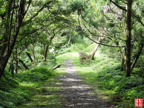過溪再往前行,林中灑落陽光,儼然綠光森林般童話美景,續走約10分鐘至本步道終點觀景台,可俯瞰龜山外澳濱海景色及龜山島,