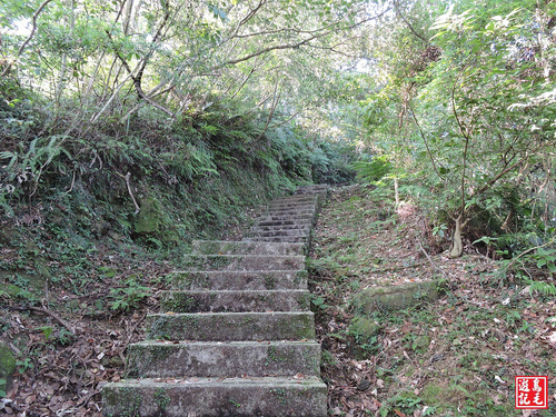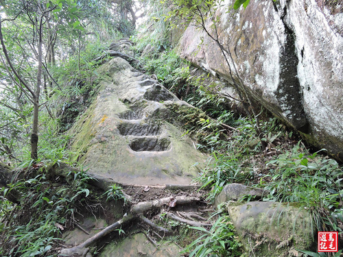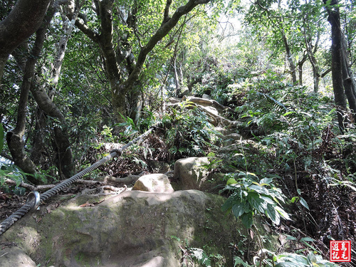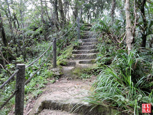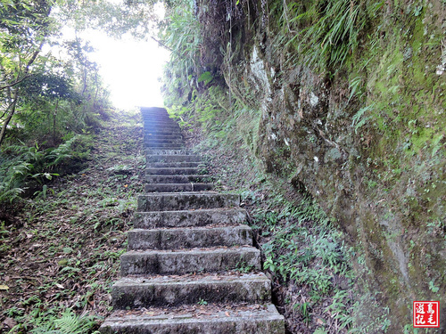 步道續從桂竹林間爬上來,今日天氣炎熱,行走林蔭下雖免烈日酷曬,陡上階梯又無風,爬起來備感吃力。