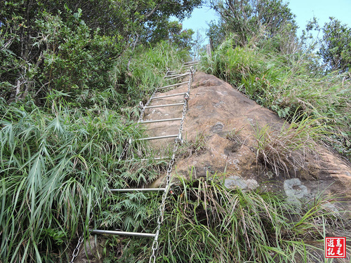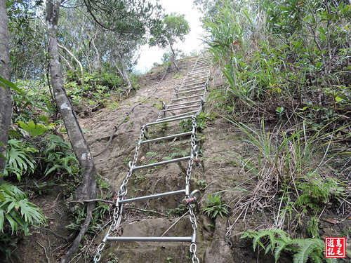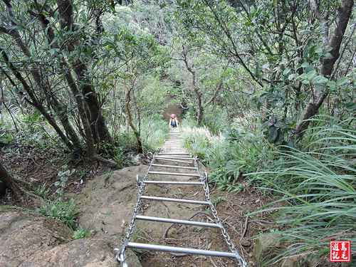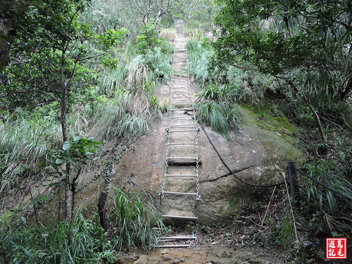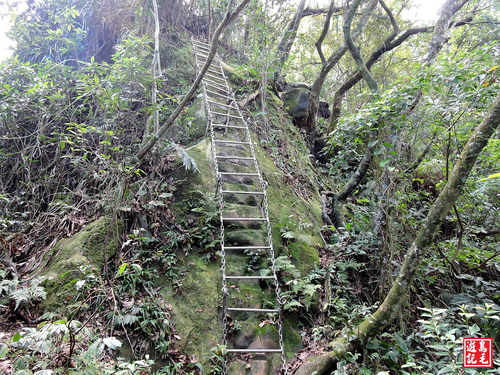 又來一段約2-3層樓高的白鐵鍊梯陡下,此處左側有繩索,不喜從鍊梯下來的可拉繩垂降,經天王廟/玉旨堂叉路續直行岩壁爬上,