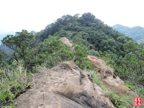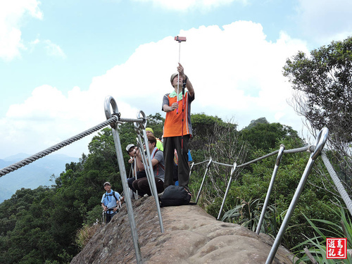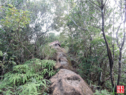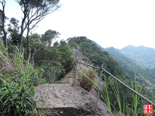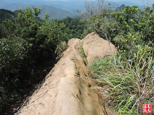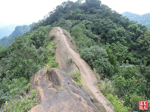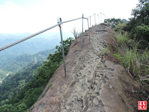 進入林中一小段續第二、三段岩稜。東、西峰之間第三段岩稜,兩端約4-50公尺只有一條細繩,雖無繩索護欄,也能淡定通過。