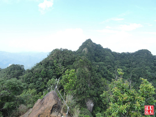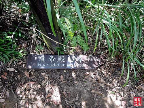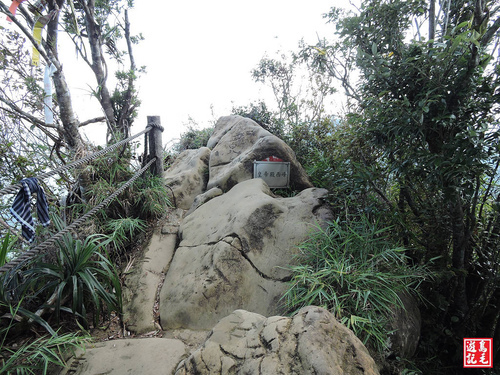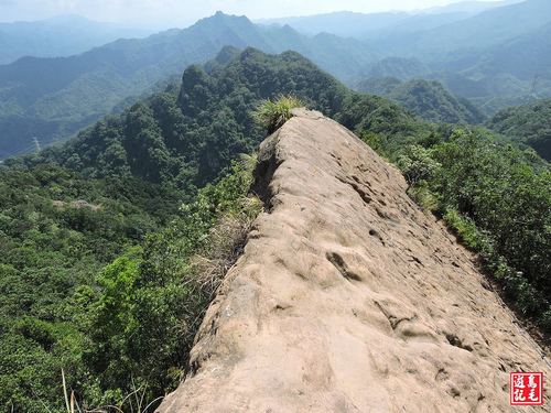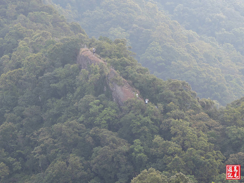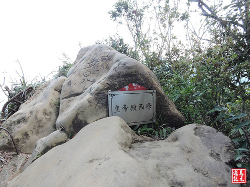 巨岩上有「皇帝殿西峰」不銹鋼牌子一面,海拔579M,此處可環顧四周群峰及即將往東峰途中的岩稜,隱約可望見岩稜上人影。