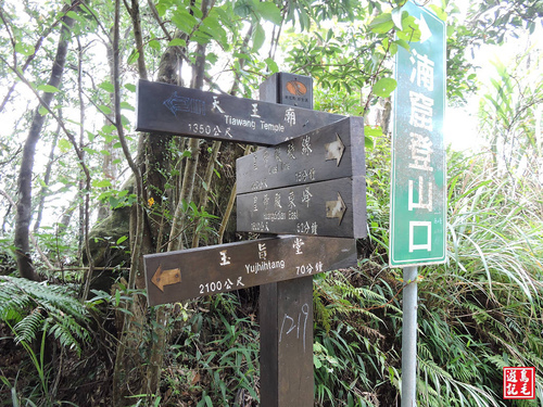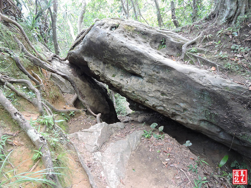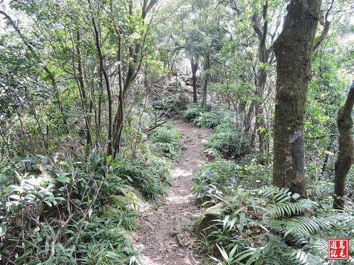經過巨岩崖壁下再往上爬400多公尺,終於爬完這段惱人的石階步道到達上方的三叉路口。湳窟山登山步道全長約2.1公里,