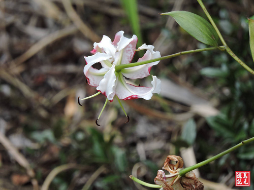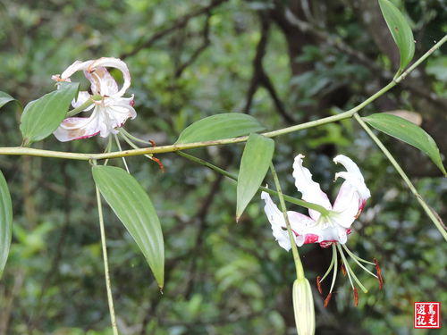 回程經過第三段岩稜時,又發現一處岩壁邊坡伸出七、八朵艷紅鹿子百合花影,可惜雜草樹枝遮掩,美中不足。