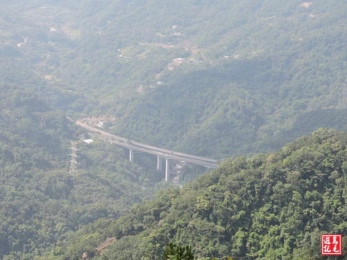 走在岩稜上,往下可俯瞰山谷之中的五號國道通過石碇高架段,還有遠在台北信義區的101大樓突起於山嶺之後。