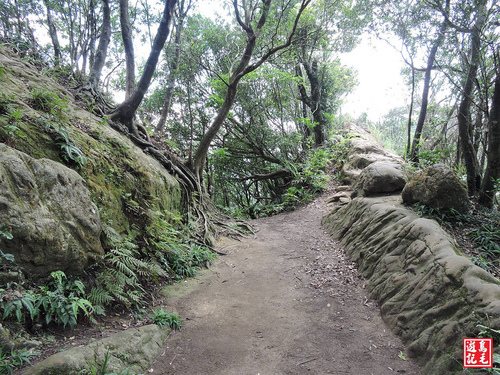 經過往入口停車場的兩處右下叉路,續直行往東峰,沿著邊坡長陡岩石步道攀爬直上,林間多為芒萁及箭竹分布。