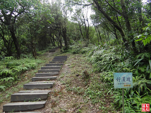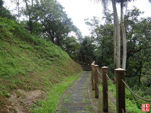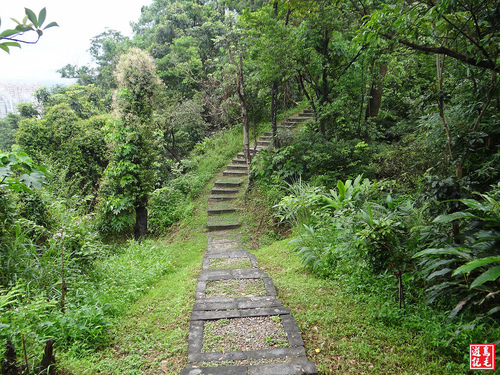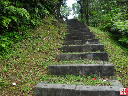 步道從玉泉宮後方上來之後,前半段約600多公尺是水泥磚塊階梯步道,坡度不大。此山因遠望山形如伏獅雄踞一方而得名,